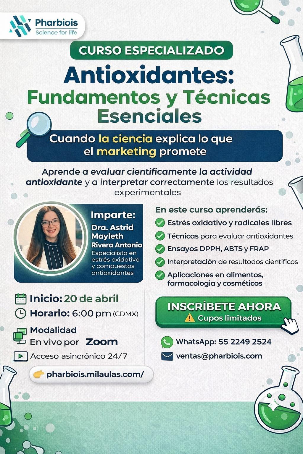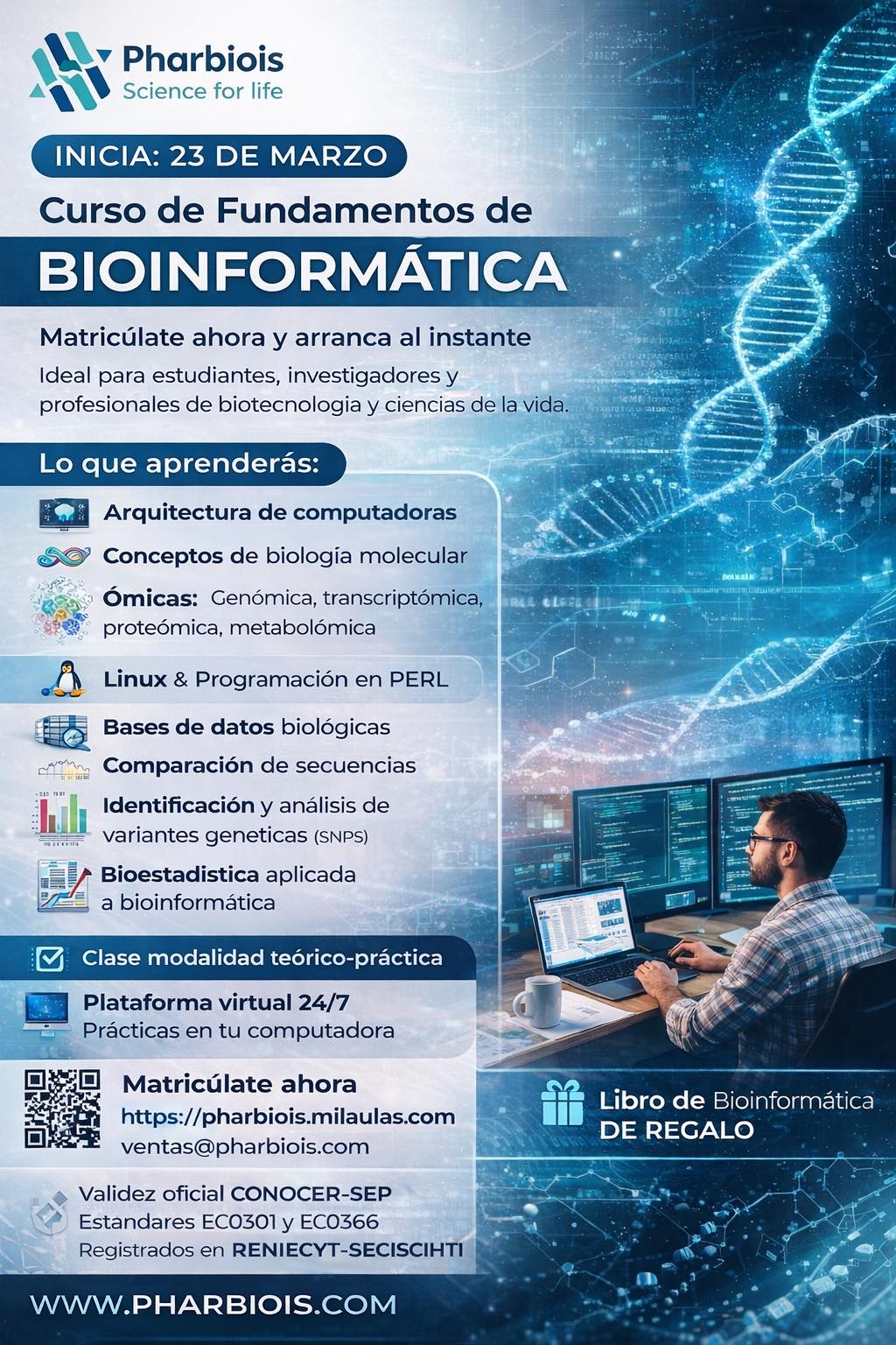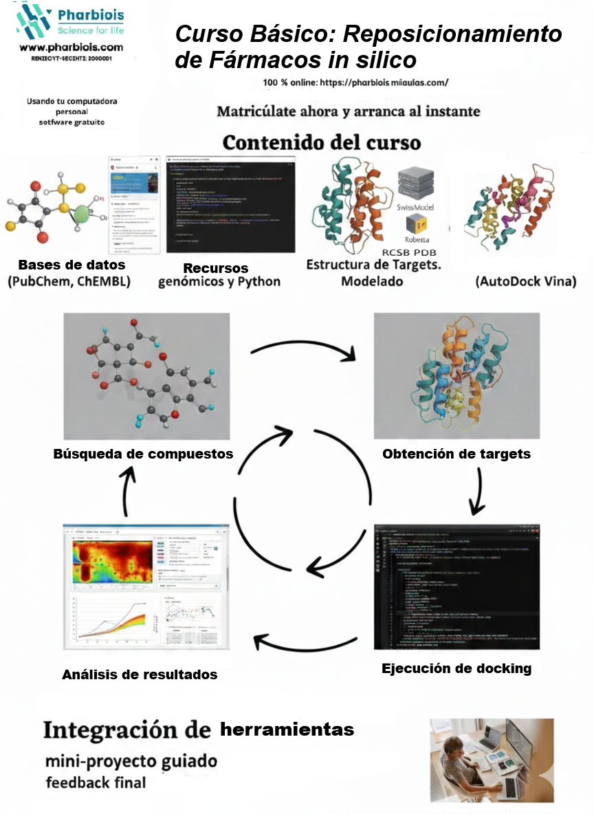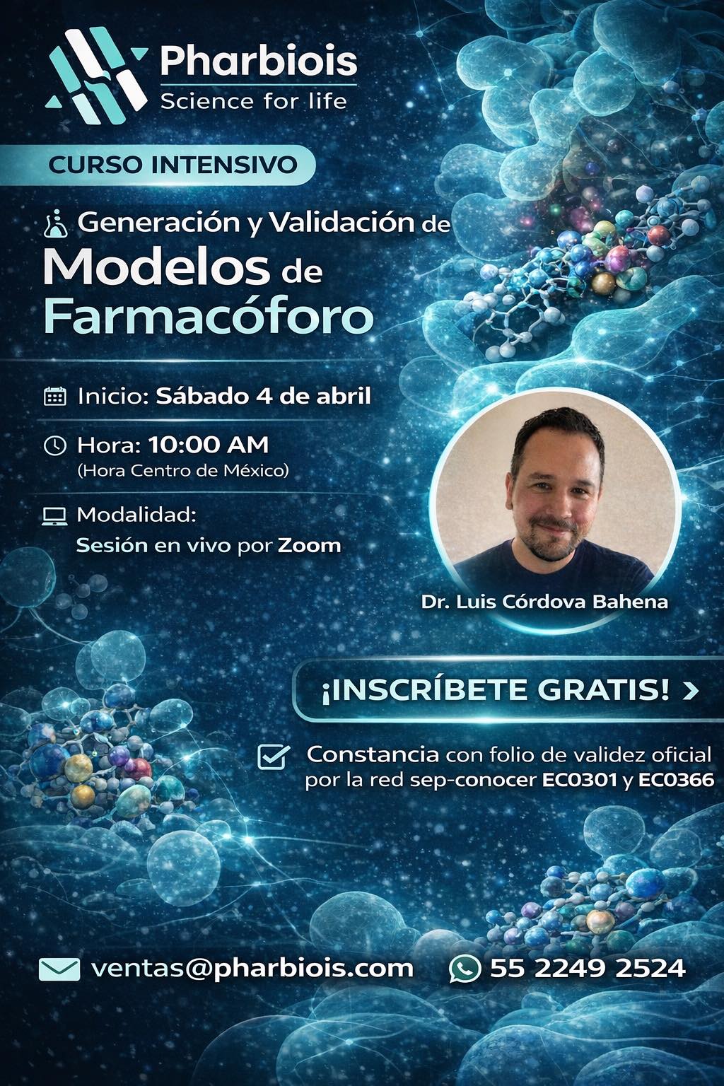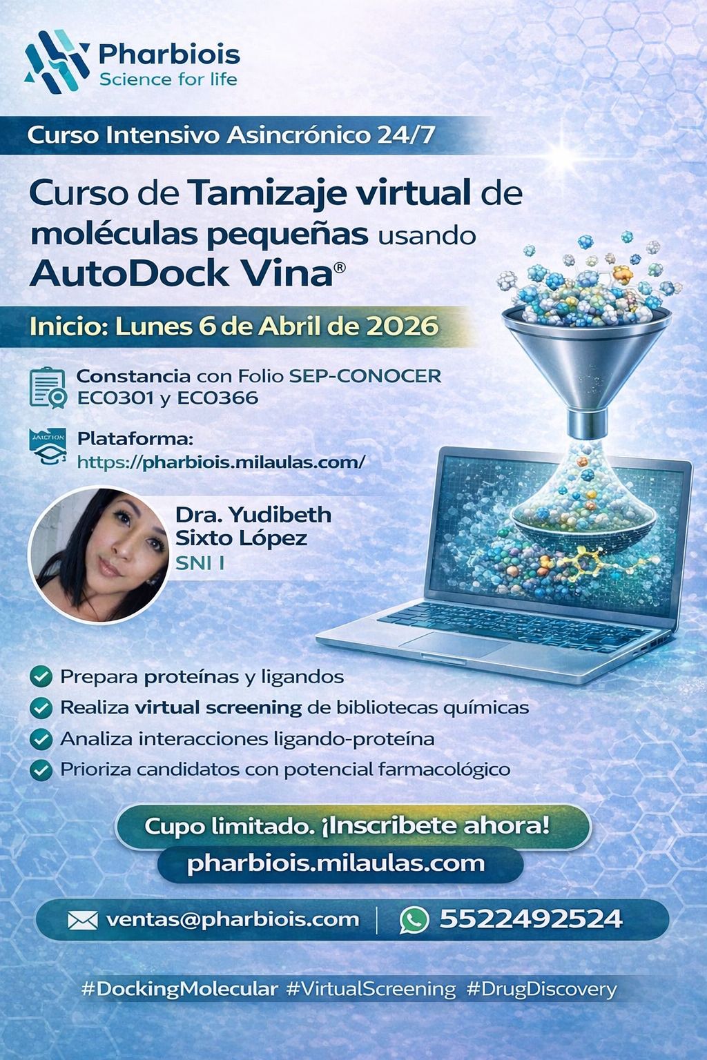 Curso práctico sobre identificación y análisis de complejos proteína‑ligando y técnicas computacionales para descubrimiento de fármacos. Cubre: búsqueda en Protein Data Bank y generación de complejos (incl. docking), análisis de interacciones con PLIP (enlaces de hidrógeno, puentes salinos, apilamiento, hidrofobicidad, enlaces de halógeno), visualización y alineamientos en PyMOL (.pse, .pdb, .sdf), creación de modelos de farmacóforo con Pharmit (elementos, agrupamiento, .json) y aplicaciones en cribado virtual, bases de datos (DrugBank, PubChem, colecciones comerciales), reposicionamiento y evaluación ADMET. Perfil de alumnos: estudiantes y profesionales de bioquímica, biología molecular, farmacología, química computacional y áreas afines interesados en descubrimiento de fármacos. Conocimientos previos recomendados: fundamentos de biología molecular y química orgánica, manejo básico de archivos estructurales (.pdb/.sdf) y nociones elementales de informática (uso de programas/servidores web). Habilidades al concluir: recuperar y preparar estructuras; generar y analizar complejos proteína‑ligando; identificar y describir interacciones intermoleculares; crear y aplicar modelos de farmacóforo; realizar cribado virtual en bases de datos y priorizar candidatos considerando propiedades ADMET y similitud estructural.