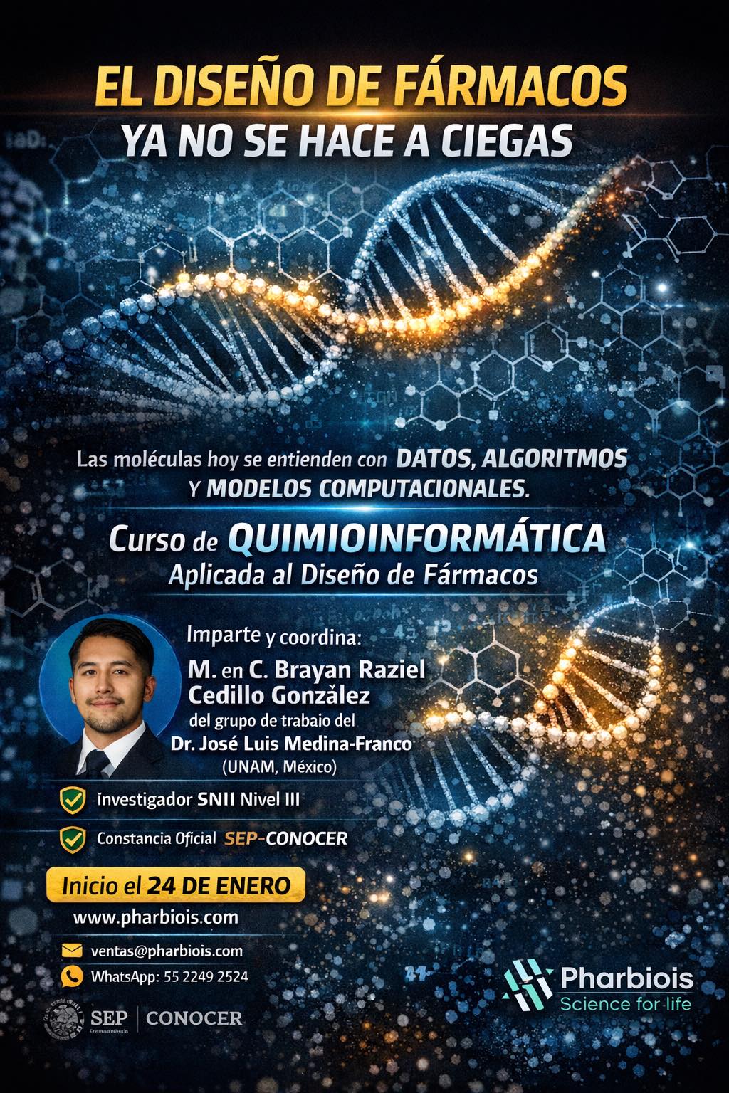 Curso enfocado en el diseño de fármacos asistido por inteligencia artificial. Cubre programación en Python, machine learning, quimioinformática, modelos QSAR y optimización molecular. Ideal para quienes buscan aplicar herramientas computacionales modernas al desarrollo farmacéutico.